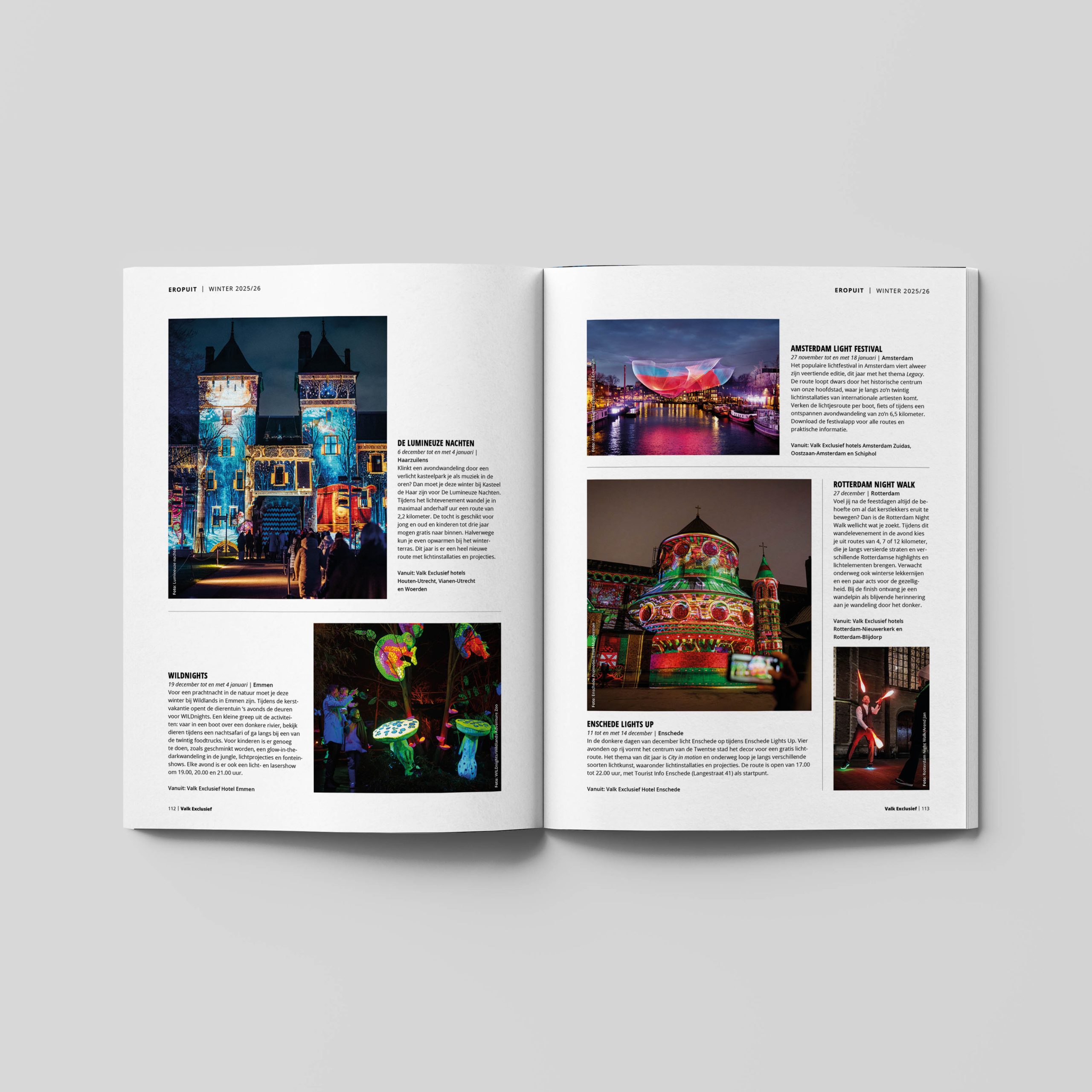 Maak jouw winter magisch met een verblijf bij Valk Exclusief! Wist je dat Hotel Schiedam al haar suites omtovert tot betoverende kerstsuites? Of geniet van de gezelligheid in Hotel Schiphol, waar je wordt omringd door de meeste kerstbomen. Combineer je verblijf met een bezoek aan het Nederlands IJsbeelden Festival in Biddinghuizen, waar indrukwekkende sculpturen je versteld doen staan. Liever naar Amsterdam? Bezoek Het Amsterdamse Winterparadijs met schaatsbanen, optredens en een magisch reuzenrad. Perfect voor een onvergetelijke winterervaring!